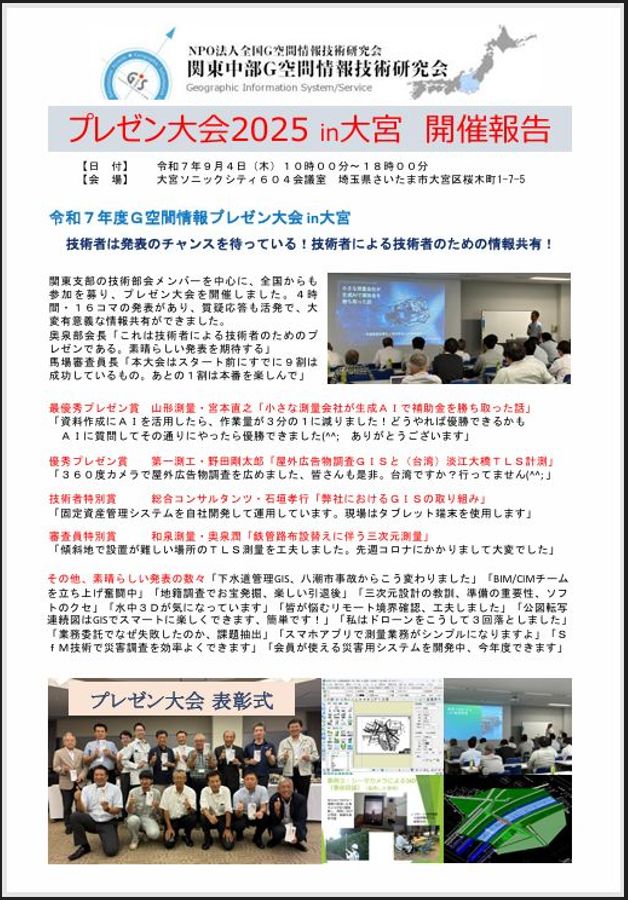 埼玉県の大宮ソニックシティにて、令和7年度G空間情報プレゼン大会in大宮を開催しました。関東部支部の技術部会を中心に、東北や中四国から有志が集まり、33名が参加、16コマのプレゼンテーションが行われました。